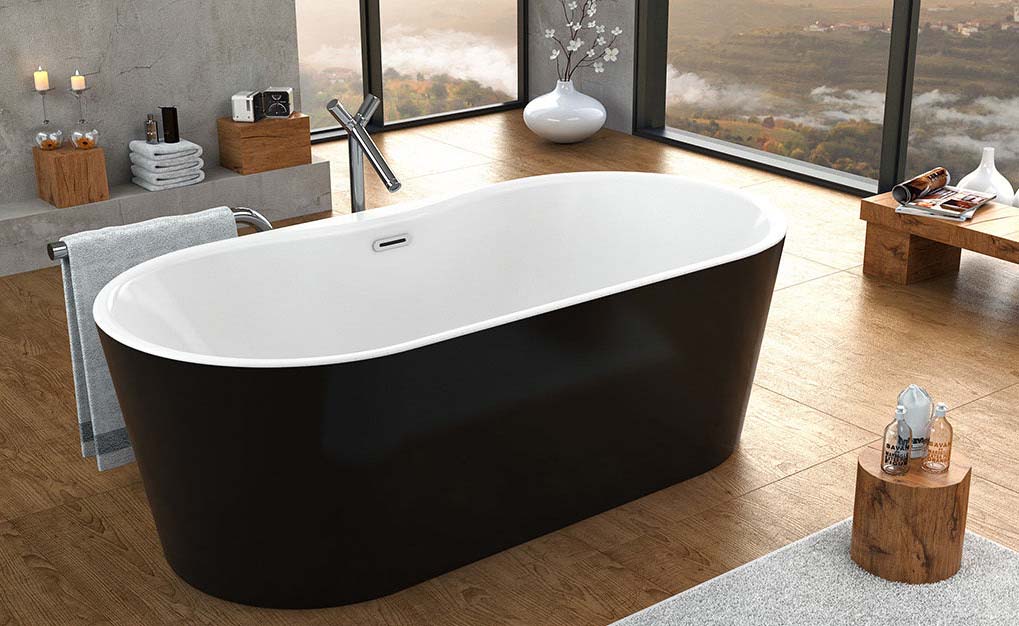 Außenmaße: 165 x 85 cmFreistehende Badewanne aus gegossenem MineralwerkstoffFarbe: weiß, schwarz/weiß, beige/weißOberfläche: geschliffen, matt