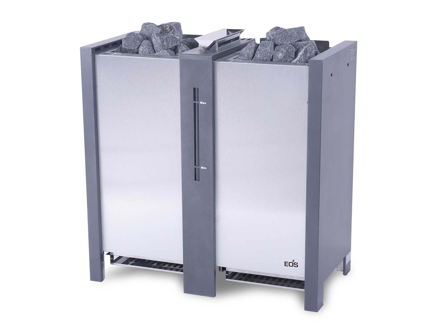 Einzigartiger Saunaofen für die Finnische Sauna im gewerblichen Gebrauch. Trotz einer geringen Bautiefe von nur 39 cm fasst der EOS Herkules XL S50: 50 kg Saunasteine.  Dabei zeichnet er sich durch ein einzigartiges Design mit zwei getrennten Steinkörben aus. Aufgüsse können abwechselnd rechts und links erfolgen und bescheren so ein noch ausgeglicheneres Saunaklima. In der Vorderansicht bilden die Frontseite aus gebürstetem Edelstahl und die Seitenteile im Anthrazit Perleffekt einen optimalen Kontrast. Die Rückseite ist flach, sodass der Saunaofen optimal vor Glasflächen platziert werden kann. Der EOS Herkules XL S50 vereint Höchstleistung mit einzigartigem Design.   Standofen der Luxus-Klasse  für die Finnische Sauna. Optimal für mittelgroße gewerbliche Kabinen. Zwei getrennte Steinkörbe je 25 kg Volumen verleihen diesem Modell sein einzigartiges Design und sorgen für verbesserte Temperaturstabilität. Aufgüsse können abwechselnd rechts und links erfolgen.Ihre Vorteile: • Robuste Konstruktion, komplett aus Edelstahl. • Zwei separate Steinkörbe je 25 kg Volumen. • Mit Behälter für Duftstoffe und Kräuter. • Servicefreundlich - Wechsel der Heizstäbe ohne Steinent- nahme • Platzsparende Bauweise - nur 38,5 cm Tiefe. • Flache Rückseite mit versenktem Anschlusskasten - optimal für die Aufstellung vor einer Glasfläche. • Made in Germany - Qualität von EOS.